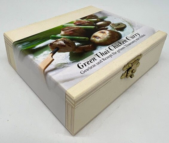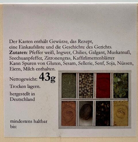 Inhalt: Der Kasten enthält 8 Gewürze, den Einkaufszettel und das Rezept, Größe: 11cm x 9 cm x 3,5 cm