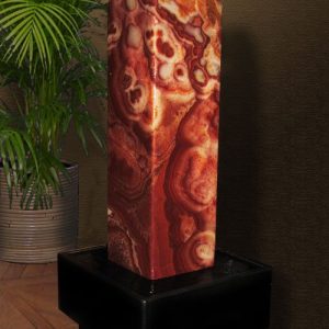 Der vornehme in graustufen geaderte Marmor wurde in aufwendiger Handarbeit geformt und geschliffen. Das Wasser fließt sanft über die runden Formen dieser Wasserskulptur.