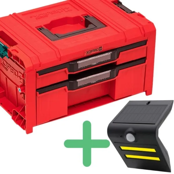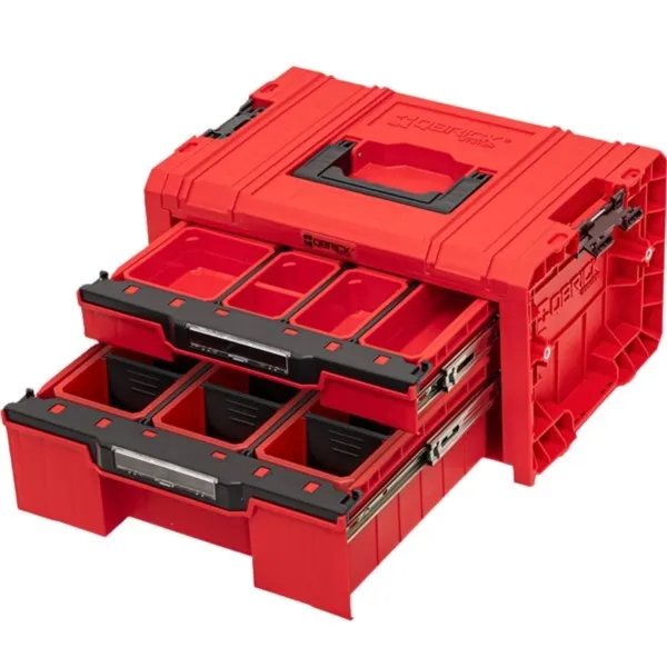Die Qbrick System PRO Schublade 2 Toolbox Expert ist eine geräumige, modulare Werkzeugkiste mit zwei Schubladen, die auf Metallschienen herausgezogen werden können. Ein praktischer Knopf ermöglicht einen einfachen Zugriff auf ihren Inhalt. In der Expertenversion haben wir die Schubladen mit 6 verstellbaren Trennwänden und 10 Behältern ausgestattet, 7 auf der oberen Ebene und 3 tiefe Behälter mit Unterteilungen auf der unteren.